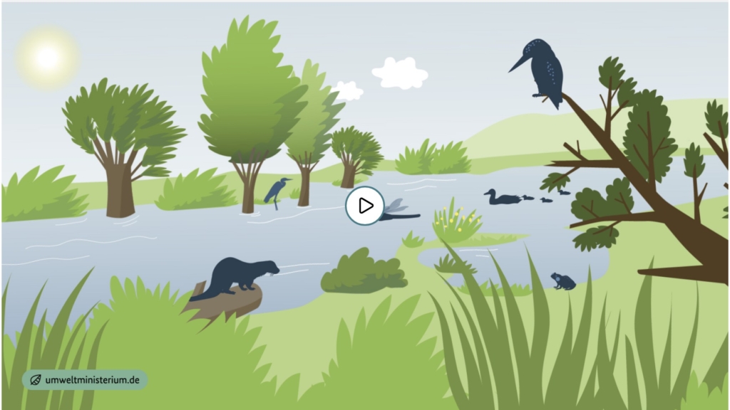 Das Video erläutert, wie Fluss-Auen zum Klimaschutz beitragen und welche Bedeutung sie als Lebensraum für Pflanzen und Tiere haben. Zudem zeigt das Video auf, wie das „Aktionsprogramm Natürlicher Klimaschutz“ des BMUKN Fluss-Auen stärkt und schützt.